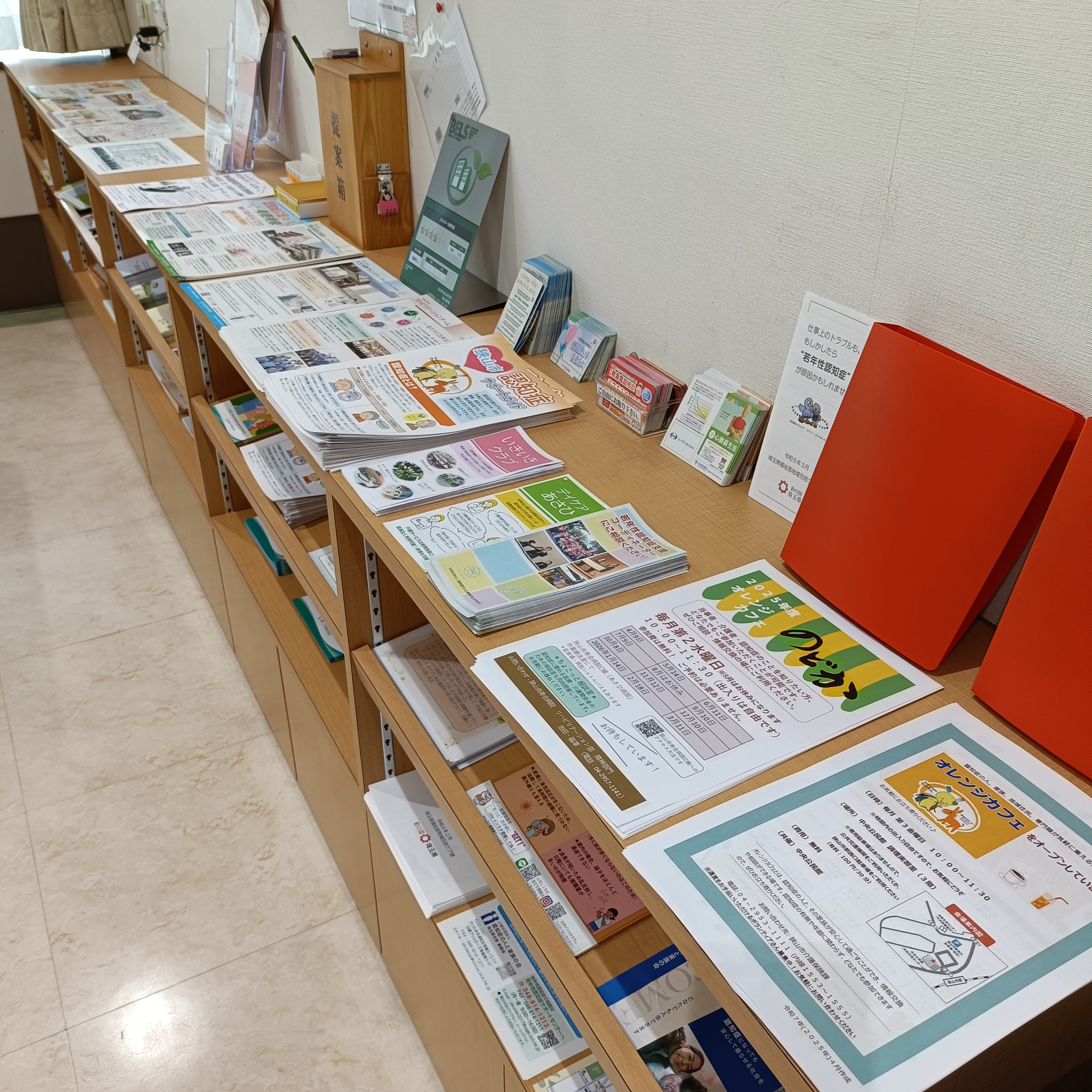 当院のパンフレットコーナには、医療法人尚寿会関連のリーフレットだけでなく、狭山市内の認知症相談窓口などが書かれている認知症サポートガイド、オレンジカフェのリーフレット、市内のイベントのチラシなどが置かれています。