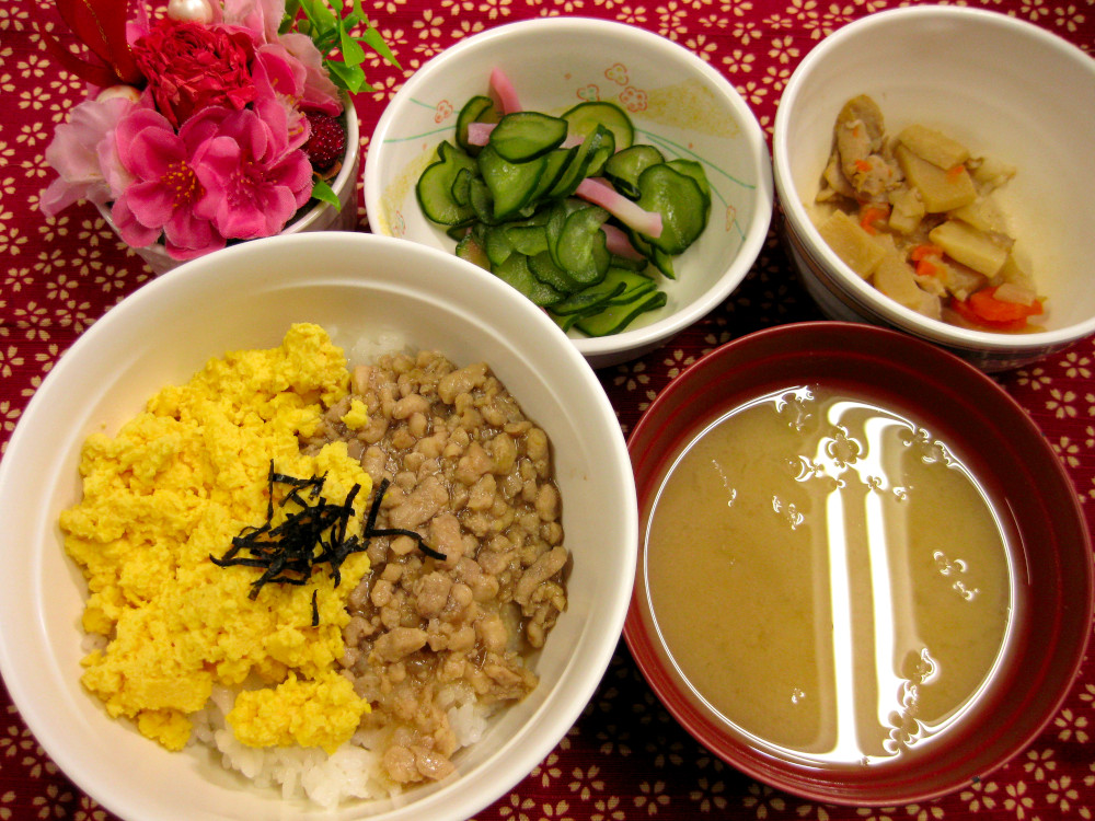鶏肉と卵をそぼろ状にして、たっぷりとご飯の上にのせました。