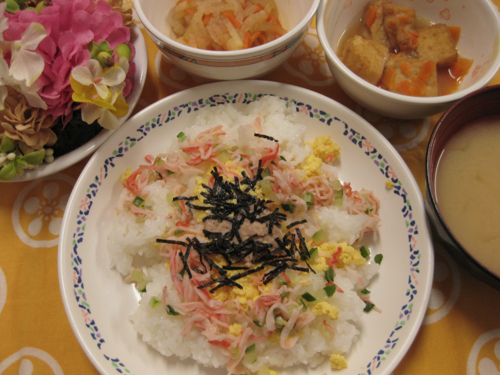 今日のお楽しみメニューはサラダ寿司です。胡瓜・カニカマ・ツナなどを彩りよく盛り付けました❗